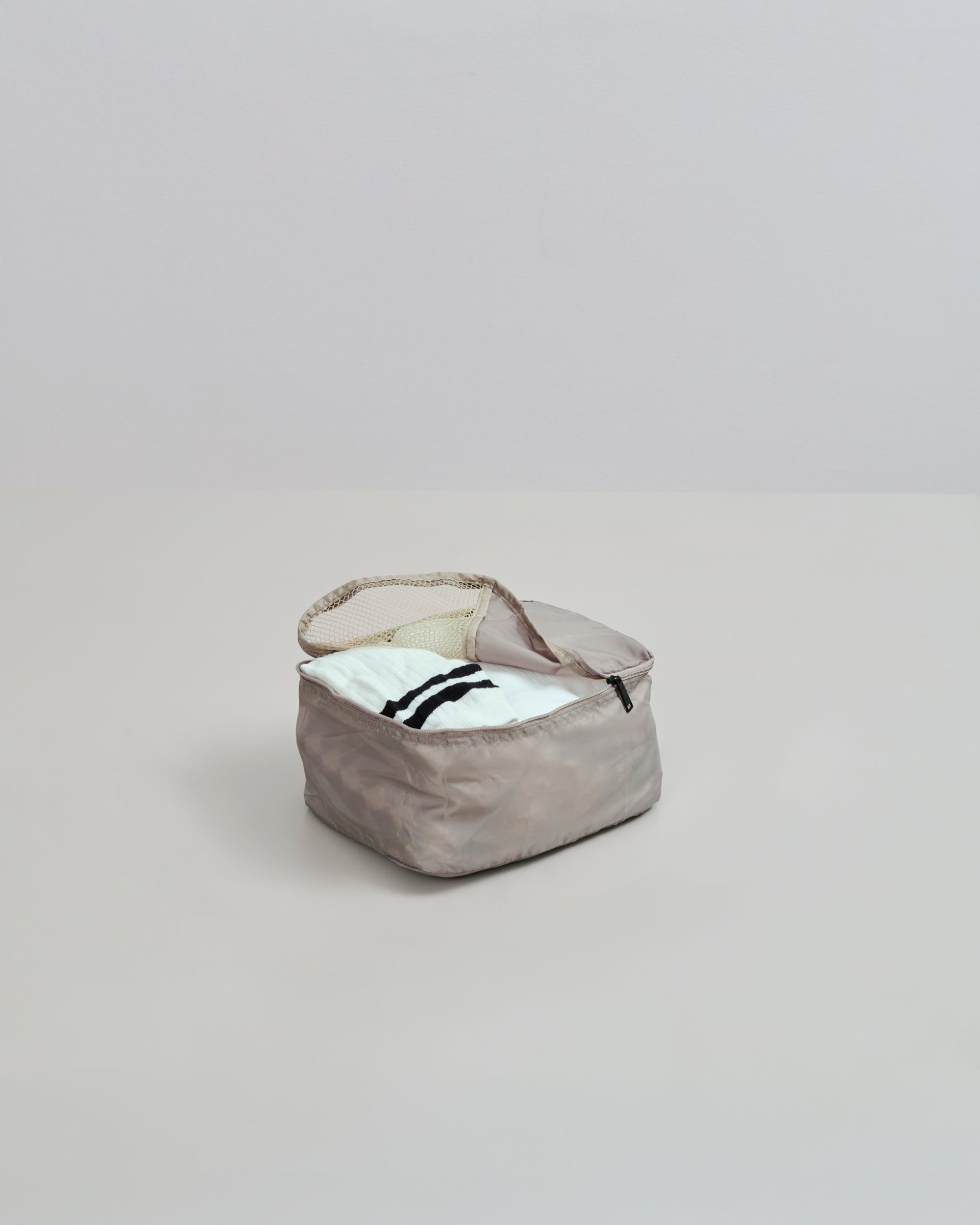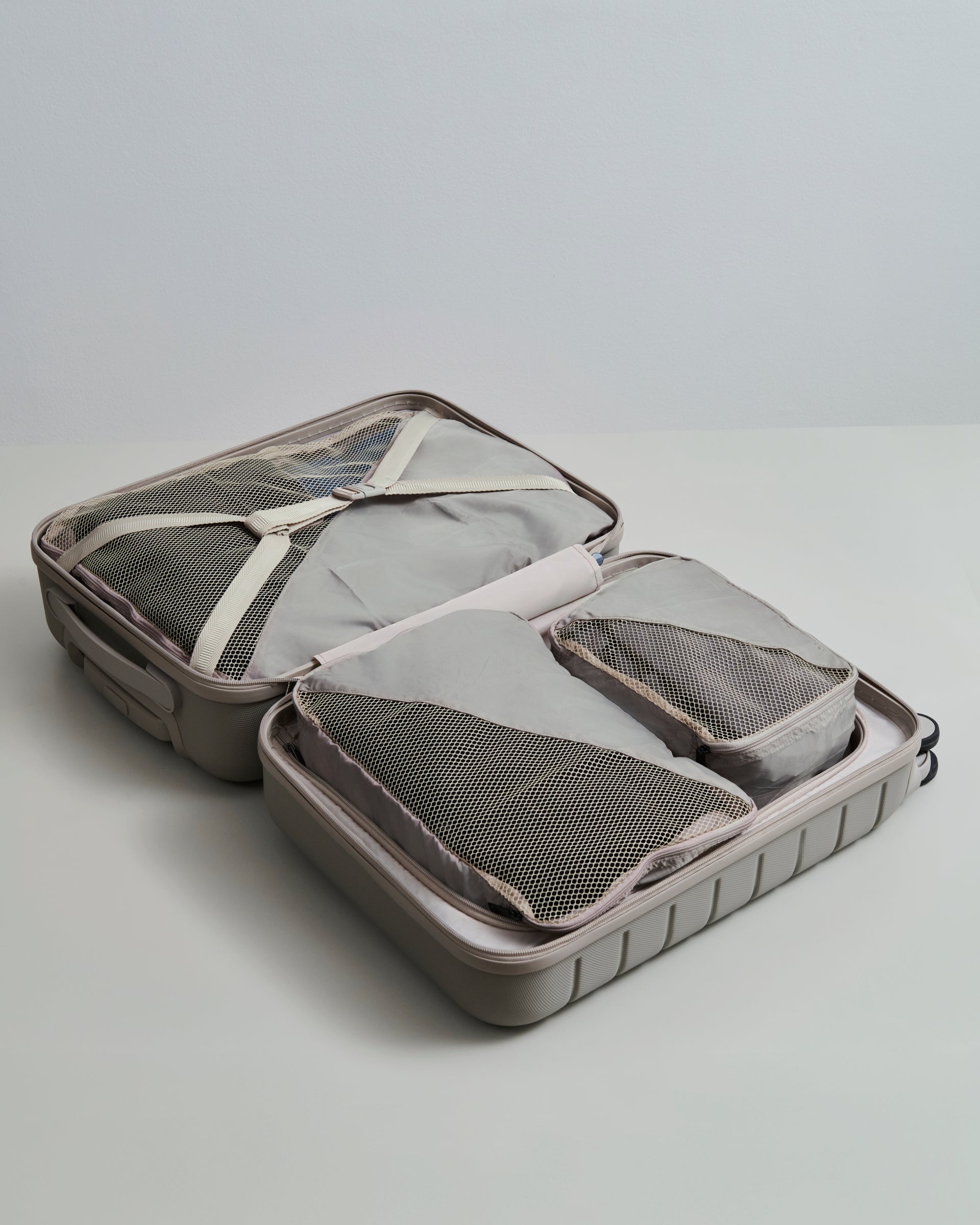 Dette settet med pakkekuber inneholder pakkekuber i størrelsene S, M og L. De kan brukes til å organisere tingene dine når du pakker kofferten, og hovedstoffet er laget av sertifisert resirkulert materiale. De lukkes med glidelås, og på toppen av pakkekubene er det et nettingmateriale slik at du enkelt kan se hva du har pakket.