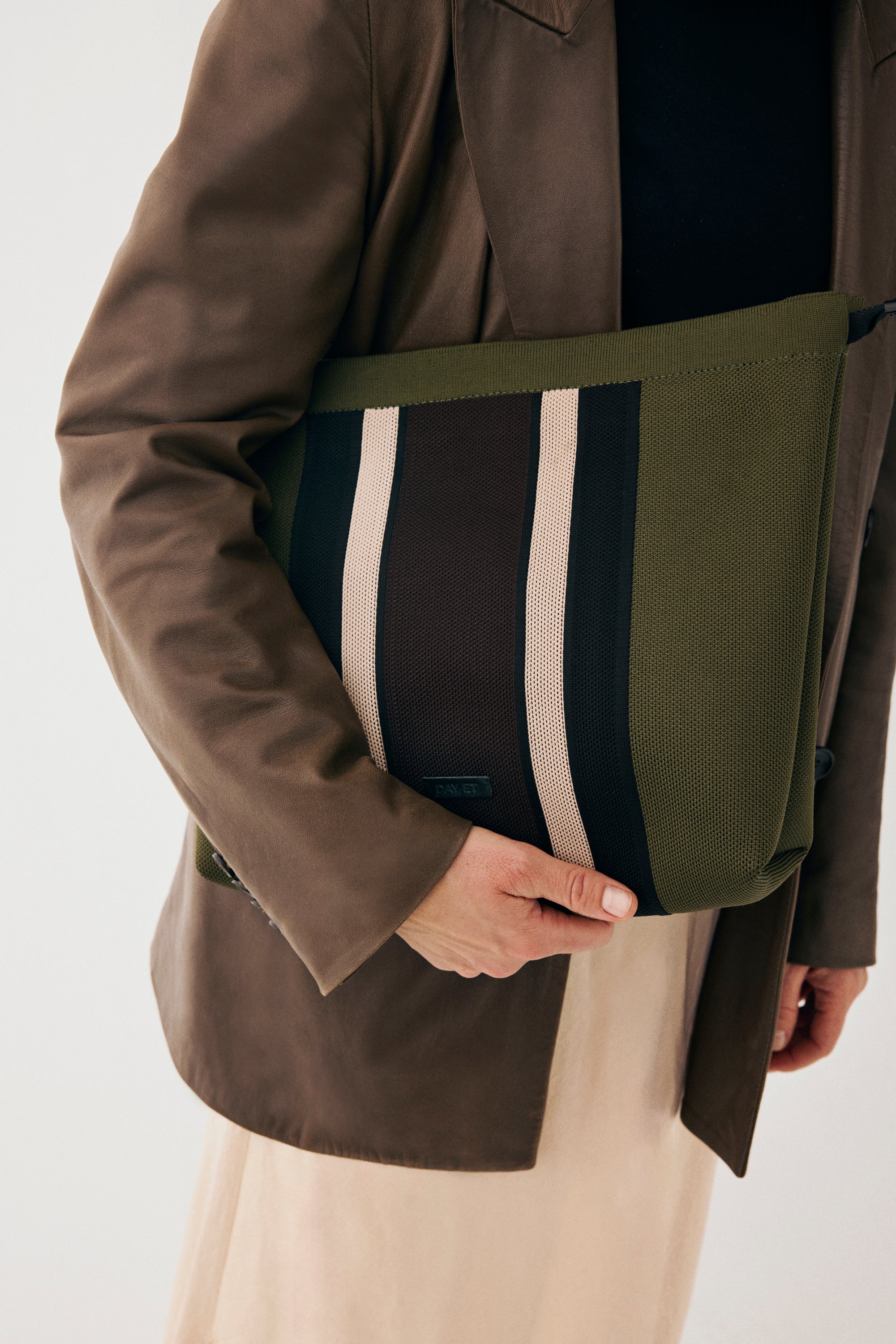 Denne vesken er laget av et mykt, strikket jerseymateriale og har en romslig form med plass til en 13» bærbar PC. Den lukkes med en nedsenket glidelås som gir et enkelt og avrundet uttrykk. Bruk den som clutch eller som oppbevaring i en større veske - et allsidig design som fungerer like godt til jobb som til fritid.