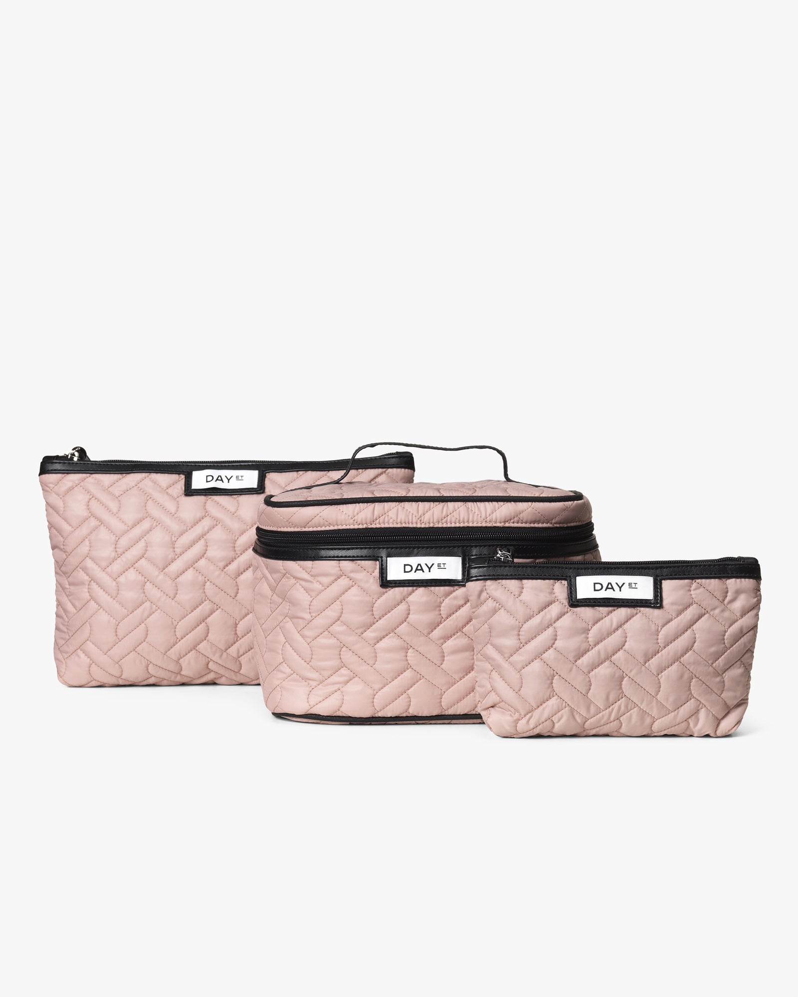 Dette settet er perfekt for oppbevaring av toalettsaker, skjønnhetsprodukter og sminke. Det ytre stoffet og det indre fôret er laget av 100 % sertifisert resirkulert materiale. Settet består av en sminketake, en større toalettmappe og en mindre sminkeveske. De lukkes med glidelås og er designet i et stripete materiale.