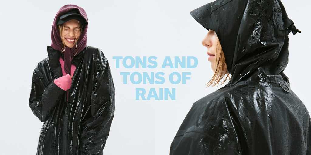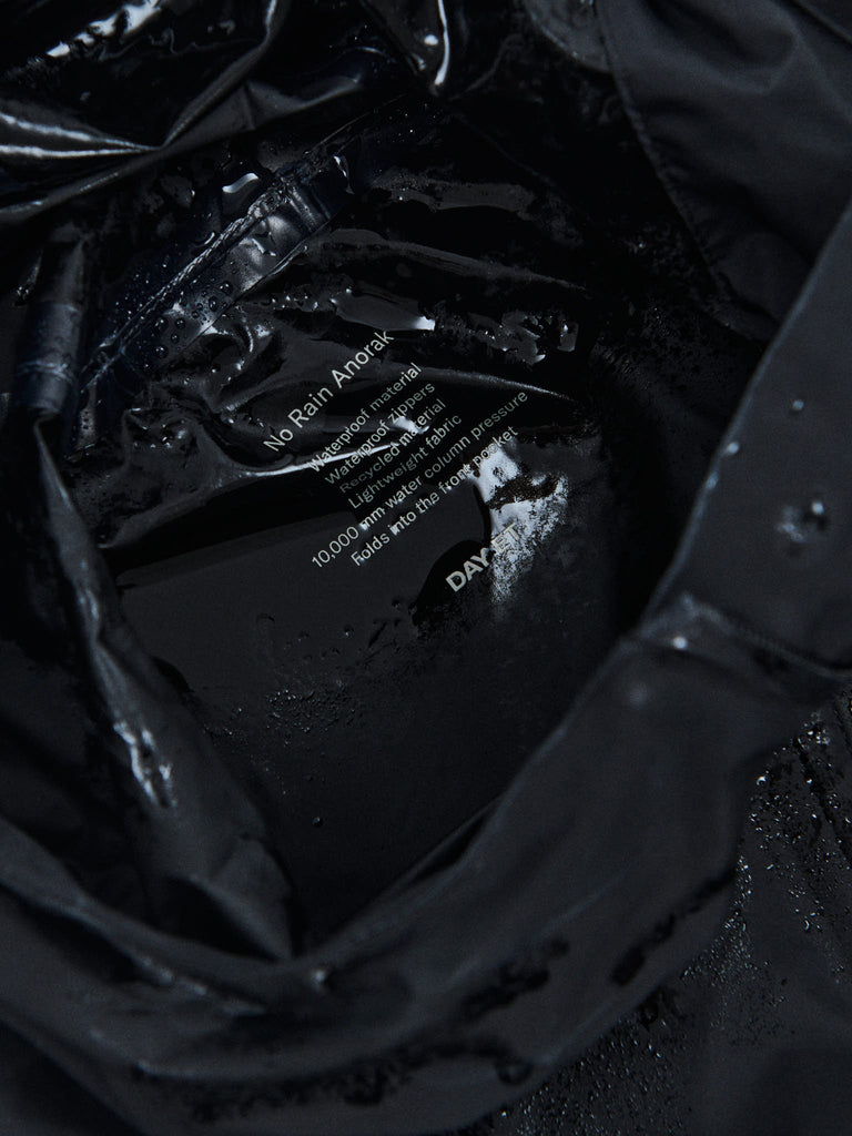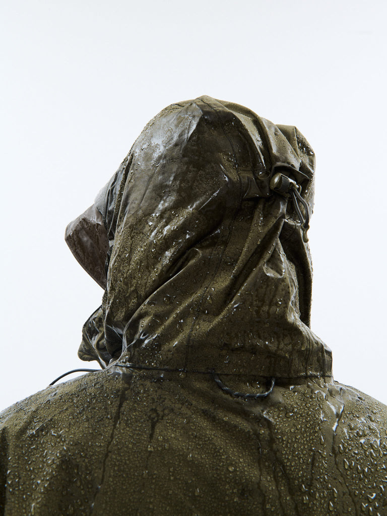 The collection includes the No Rain Anorak and No Rain Coat, available in Dark Olive and Black, sizes S–L.