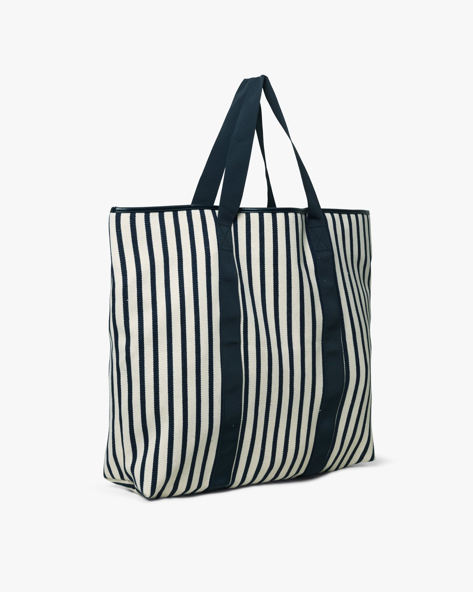 Denne store strandtaske er rummelig og designet med brede stropper, der sikrer nem og komfortabel transport. Tasken har et elegant læderlignende kantbånd og en indvendig lynlåslomme til sikker opbevaring af mindre genstande. Den åbne top gør den nem at pakke og tage med.
