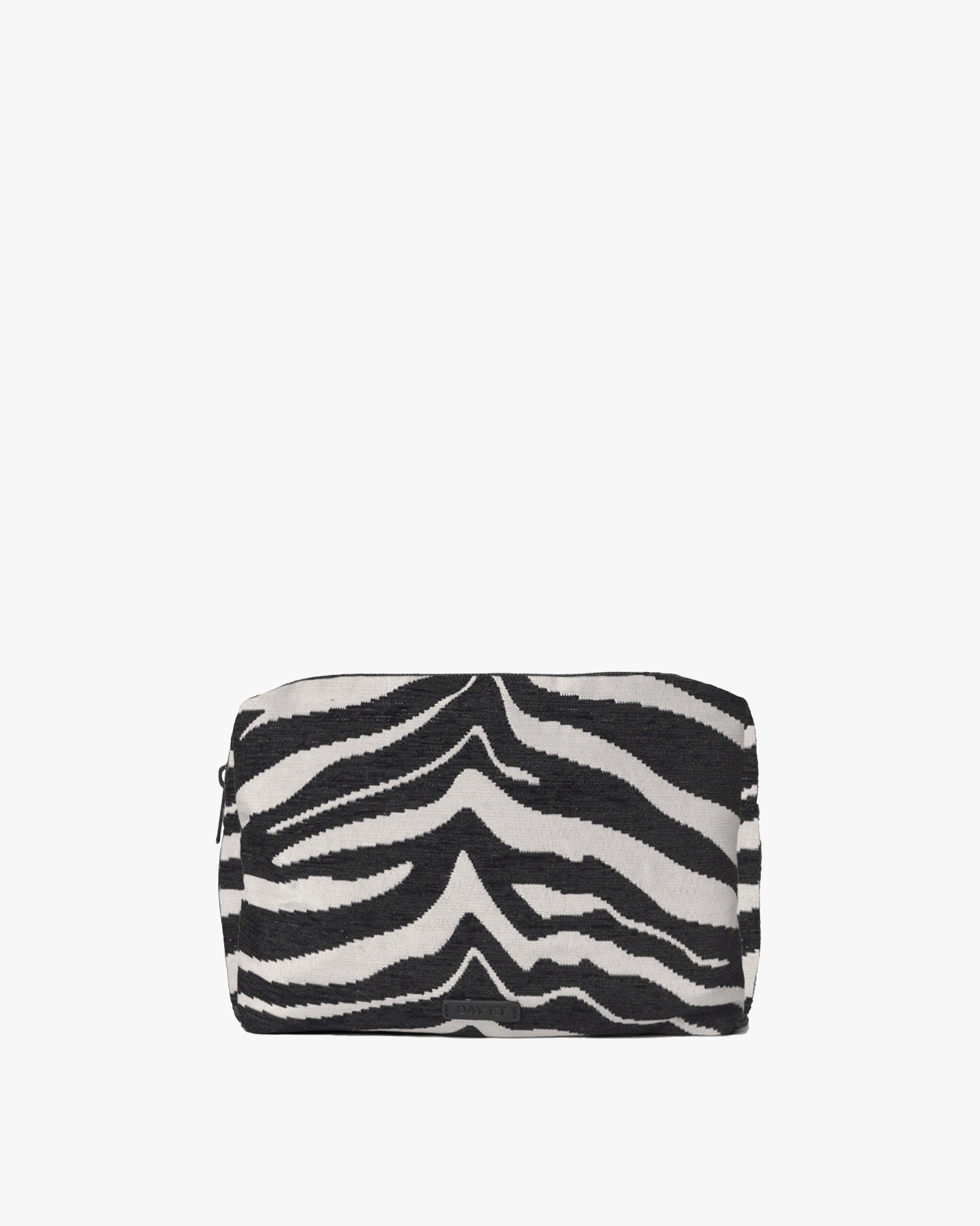 Denne toilettaske har en rummelig og funktionel form, der gør den velegnet til både makeup og toiletsager. Den er lavet i jacquardvævet stof med zebramønster, og indvendigt har den både en åben og en lynlåslomme samt lyst twillfor. En alsidig taske til hverdagens behov.
