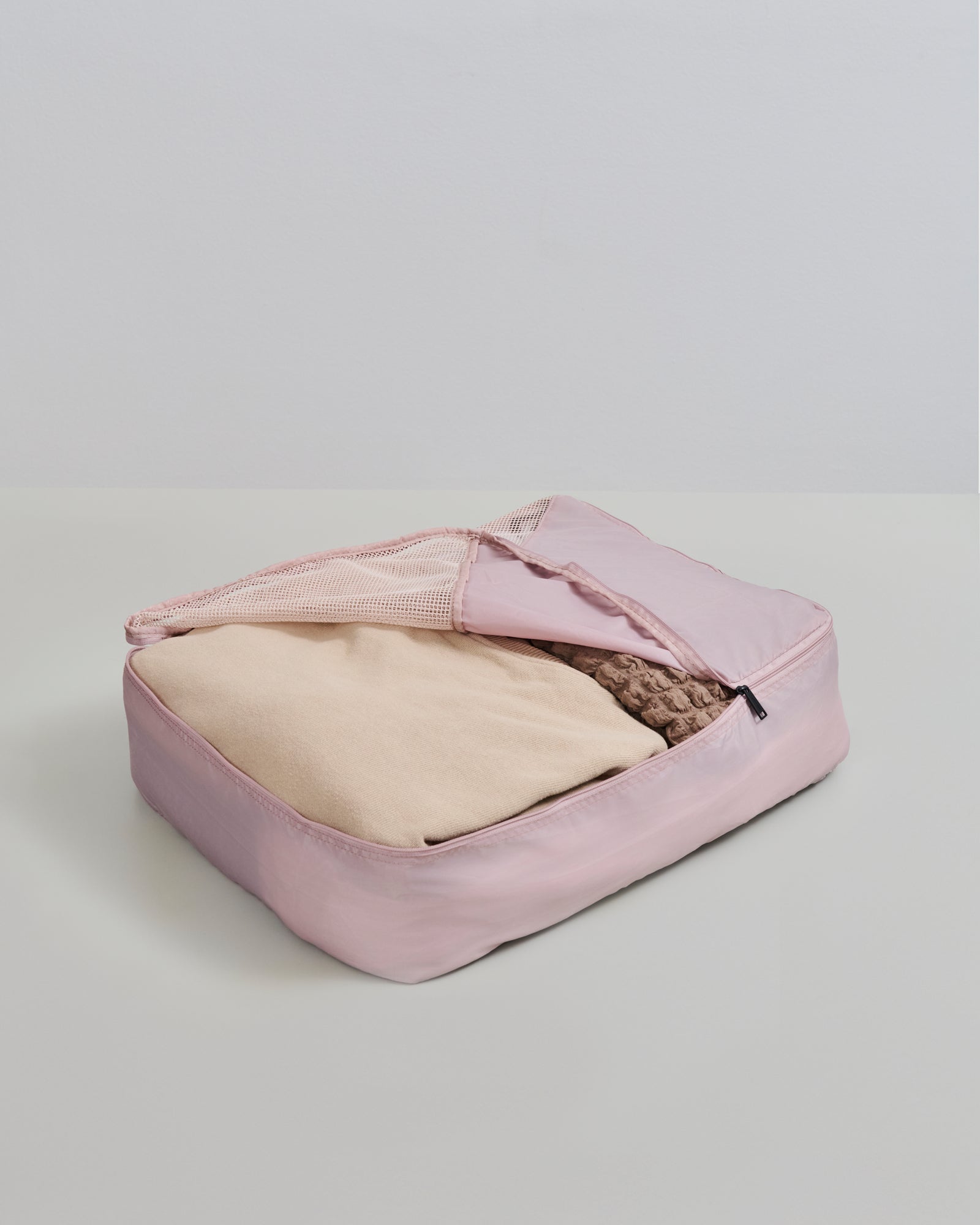 Dette settet med pakkekuber inneholder pakkekuber i størrelsene S, M og L. De kan brukes til å organisere tingene dine når du pakker kofferten, og hovedstoffet er laget av sertifisert resirkulert materiale. De lukkes med glidelås, og på toppen av pakkekubene er det et nettingmateriale slik at du enkelt kan se hva du har pakket.